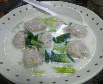 3、新しいお湯(1カップぐらい)に中華スープのもと3振りぐらいを入れ、沸騰したら肉団子とチンゲン菜を入れる。 あくを取り肉団子に火が通ったら牛乳1/2カップと水で溶いた片栗粉を少々入れて少しとろみをつけて、最後に塩コショウで味をととのえる。