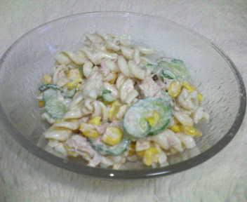 材料 ・マカロニ ・ツナ缶1 ・コーン缶 ・キュウリ ・玉ねぎ少々 ・塩コショウ ・マヨネーズ